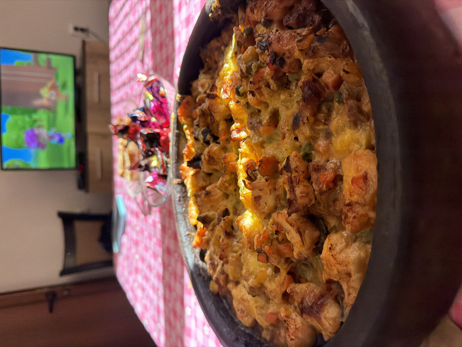 The image displays an indoor scene in Erma Reka, Bulgaria. In the immediate foreground, a dark, shallow earthenware dish (likely a *guvech*) contains a baked meal. The food consists of irregularly cut pieces of chicken, diced carrots, green vegetables, and a layer of melted, golden-brown cheese across the top, showing areas of browning. The dish is situated on a table covered with a pink and white checkered tablecloth. In the midground, behind the main dish, a clear glass bowl holds an assortment of individually wrapped candies in brightly colored, reflective wrappers, primarily red and purple. Further back on the table, a light blue smartphone is partially visible. The background reveals a domestic room environment. To the left, a light brown wooden door with a dark handle is closed. A dark wooden chair with a lighter seat back is positioned behind the table. Centered in the background is a flat-screen television resting on a light brown wooden cabinet. The television screen displays a colorful animated scene featuring two cartoon characters, one purple and one orange, in a vibrant green outdoor setting. To the right of the television, a white electrical outlet is visible on the wall. The scene is illuminated by strong, directional light, likely natural sunlight, casting distinct shadows and reflections, particularly on the table and the food. No people are present, and no actions or interactions are depicted.