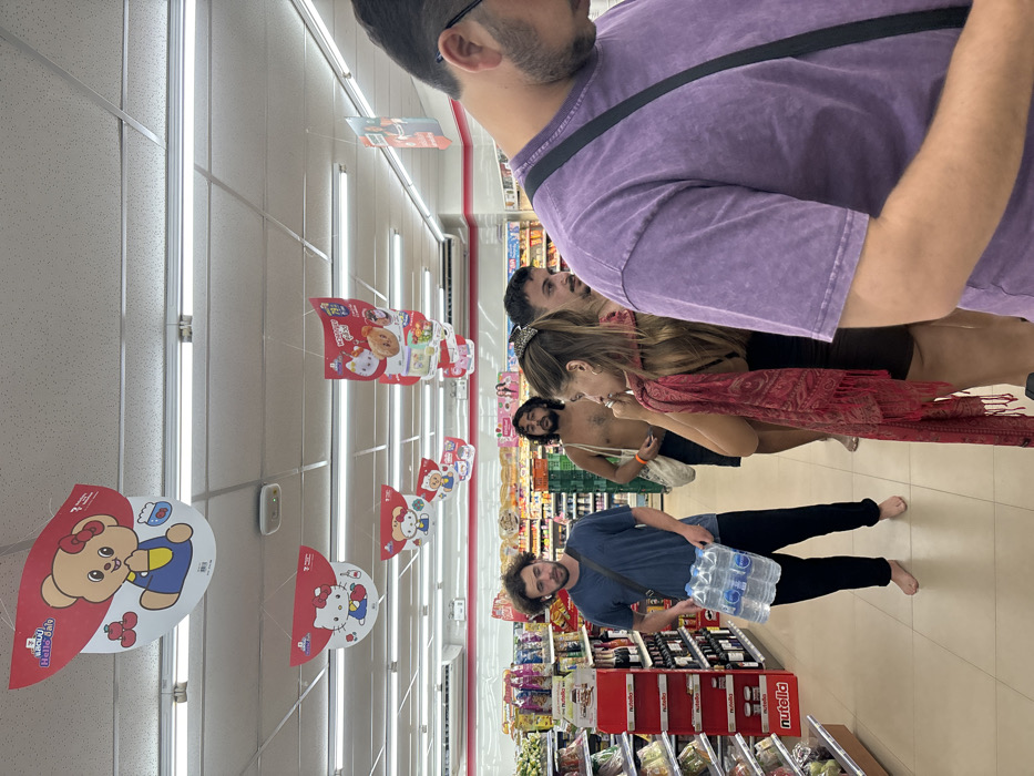 The image depicts the interior of a 7-Eleven convenience store located in Baan Nai Wok, Thailand. The scene is illuminated by overhead fluorescent strip lighting, casting light onto a light-colored tiled floor and white suspended ceiling. Numerous red and white promotional signs featuring cartoon characters such as Hello Kitty and a bear character are suspended from the ceiling. In the foreground, an individual is partially visible on the right, seen from the chest up, wearing a textured purple t-shirt and a black shoulder strap across his chest. His head is angled downwards. In the mid-ground, a group of people is visible. To the right, a female with long brown hair, wearing a dark top and a red patterned shawl draped over her shoulders, looks towards the left. She has a ring on her left index finger. Behind her, a male with short dark hair and a beard is partially visible, looking towards the right. To the left, a male with curly dark hair and a beard, wearing a dark blue t-shirt and dark pants, is standing barefoot while holding a six-pack of bottled water. He has white earbuds in his ears and is looking towards the left. Further in the background, another male individual with dark hair and a beard stands shirtless, wearing dark shorts and carrying a light-colored tote bag over his right shoulder. The store aisles are stocked with various products. Shelves on the left display beverages, snacks, and multiple jars of Nutella. Deeper into the store, refrigerated sections and other product displays are visible.