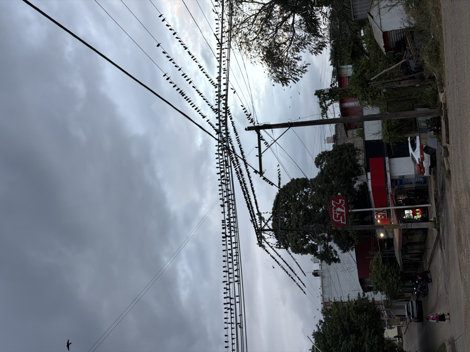 Birds perch densely on overhead wires beneath a cloudy sky. A "SIX" sign is visible beside a building, partially obscured by a tree. Below, a street scene includes parked vehicles, vegetation, and pedestrians. The photograph is rotated counter-clockwise, making the sky appear on the left side.
