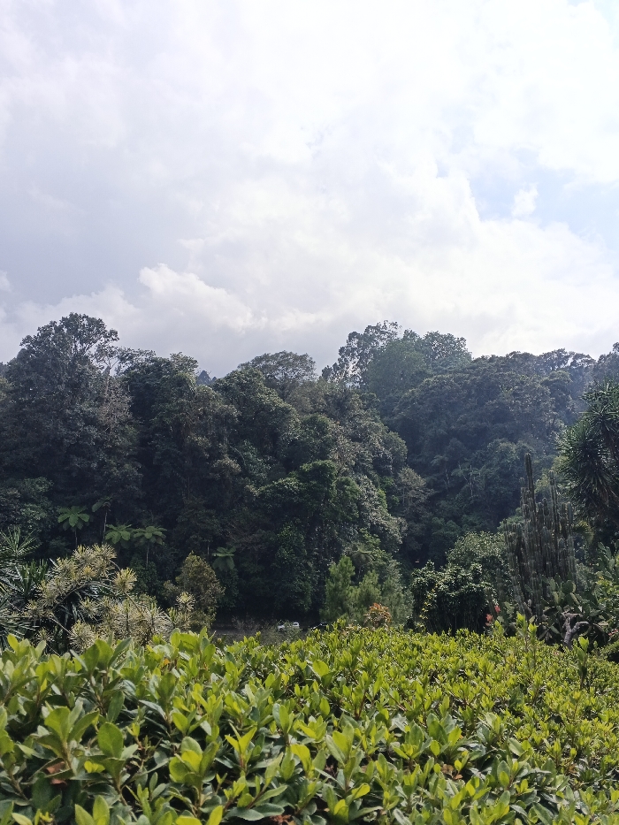 The image presents a natural, verdant landscape situated in Soibada, East Timor. The foreground is dominated by a dense layer of light green, broad-leafed shrubs, viewed from a low perspective, forming a continuous mass across the lower portion of the frame. Beyond these shrubs, the midground reveals a variety of darker green flora, including tree ferns with radial fronds, scattered smaller trees, and several tall, multi-stemmed columnar succulent plants on the right side. A narrow, darker clearing in the center-left midground suggests a path or road, with faint, indistinct white forms possibly indicating vehicles or structures in the distance. The background features a steep, densely forested hillside covered with a thick canopy of dark green trees of varying heights and species. The sky, occupying the upper half of the image, is overcast with a mix of white and light gray clouds, with hints of pale blue visible in areas. No individuals, specific actions, or interactions are discernible within the scene.