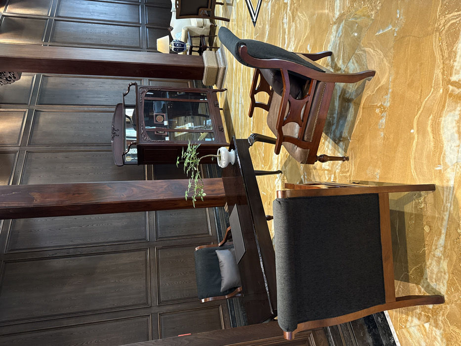 This image captures a static interior scene within a sophisticated lounge or reception area in Tongxiang, China. The environment is defined by dark, vertical wood paneling covering the walls from floor to ceiling, complemented by several large, square-cut dark wooden pillars. The flooring consists of highly polished, light yellowish-brown marble or stone, exhibiting distinctive darker veining and swirling patterns. A small segment of a black and white geometric floor inlay is visible in the far right background. In the center-left, a dark, polished wooden desk with ornate legs serves as a focal point. On its surface, a small white ceramic pot containing a verdant plant is positioned to the right, and a dark, rectangular mat lies on the left. Three chairs are arranged around this desk: a dark wooden chair with dark gray upholstery and a light gray lumbar cushion is situated behind it; another dark wooden chair with dark gray upholstery occupies the immediate foreground, facing the desk; and a third dark wooden armchair, featuring a brown leather seat, dark gray back cushion, and carved armrests, is positioned to the right of the desk, facing inward. To the mid-right, a tall, dark wooden display cabinet with glass doors and intricate carvings is visible, containing indistinct items. Further to the right, a cream-colored armchair, a side table, and a table lamp with a white shade and blue patterned ceramic base are partially visible. The scene is devoid of any individuals, actions, or interactions.