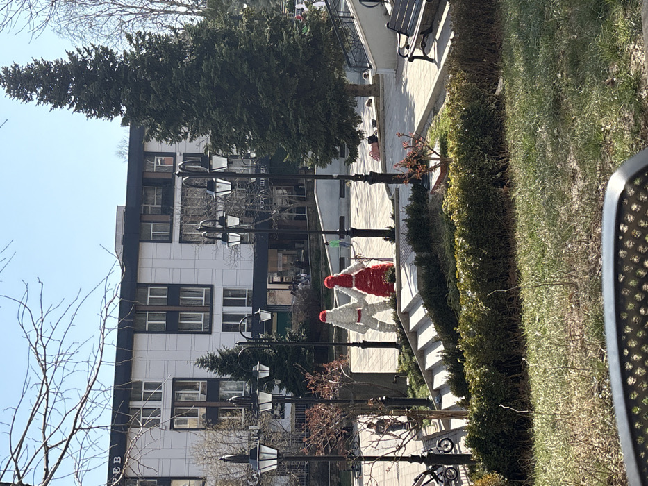 This image depicts a sunlit urban park or square in Karlovo, Bulgaria, with a prominent building in the background. In the foreground, the upper portion of a dark, perforated metal chair back is visible at the bottom edge. Above this, a patchy grassy area with some bare ground and new green growth extends. A manicured dark green hedge runs horizontally across the mid-foreground, containing a small deciduous tree with reddish buds. The midground features a paved public square. Two large, stylized figures, resembling winter holiday decorations, stand on a raised platform adjacent to a set of concrete or stone stairs. The left figure is white/silver, depicted with a red Santa hat, white beard, and white attire, holding the hand of the right figure. The right figure is predominantly red, wearing a red Santa hat and a red dress. Multiple black, ornate lampposts with multi-lantern tops are positioned throughout the square. A dark park bench with slatted seating is visible on the right side of the paved area. Several individuals populate the square: one person is partially visible near a stroller on the left, another wearing a light green jacket walks further back, and a group of people are gathered on a lower patio area in front of the background building. Two individuals are resting or lying on the paved ground near the base of a large coniferous tree on the right side of the square. A tall, dark green coniferous tree stands prominently to the right of the square, and several bare deciduous trees are scattered throughout the scene. The background is dominated by a multi-story building, likely a hotel, with a modern facade composed of light-colored panels and dark gray or black sections around the windows. The building features numerous windows across its floors. Partial Cyrillic text, including "РЕБ" and "ХО ЩЕЦ," is visible on its facade. The sky above is clear and blue.