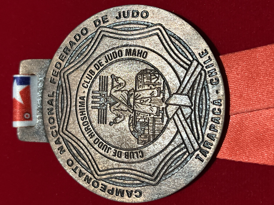 - "Judo medal. Inscribed around the edge of the medal are the words "Campeonato Nacional Federado de Judo" and "Tarapacá - Chile". Inside, "Club de Judo Hiroshima - Club de Judo Maho" encircles a central emblem depicting two figures engaged in a Judo match in front of a building. A small clip attached to the medal displays the flag of Chile. An orange ribbon is partially visible behind the medal." by FM-8OFL92, licensed under CC BY 4.0
