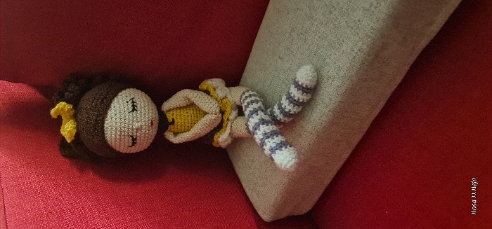 A crochet doll rests on a red couch beside a grey cushion. The doll has brown hair, a white face, and a yellow dress. Its legs are striped with white and purple. It appears handmade and slightly whimsical.