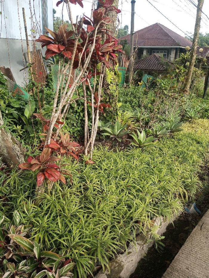 A lush garden overflows with diverse plant life. Cordyline plants with maroon foliage stand out among lower-lying greenery, including spiky agave and dense, lime-colored foliage. Behind the garden, a multi-story house with a red-tiled roof is partially obscured by trees and vegetation. The scene captures the vibrancy of a well-maintained garden blending with the surrounding landscape.