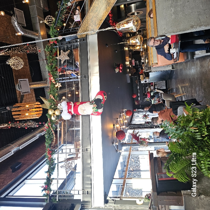 A multi-level interior space features holiday decorations. Garlands with ornaments and a Santa stocking hang from the ceiling. Seated patrons occupy tables, some working on laptops. Large windows overlook a cityscape. Industrial-style lighting fixtures illuminate the area. A plant sits in the foreground, and camera details are in the lower right corner.