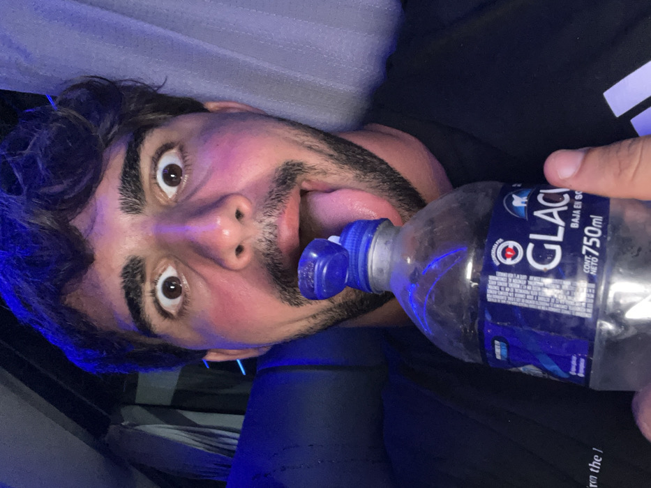A man with dark hair, a beard, and wide eyes looks at the camera with his tongue sticking out. He's holding a plastic water bottle with a blue cap to his mouth. The label "GLACIAR" is visible. The lighting has a blue hue. The background appears to be a seat and a wall.
