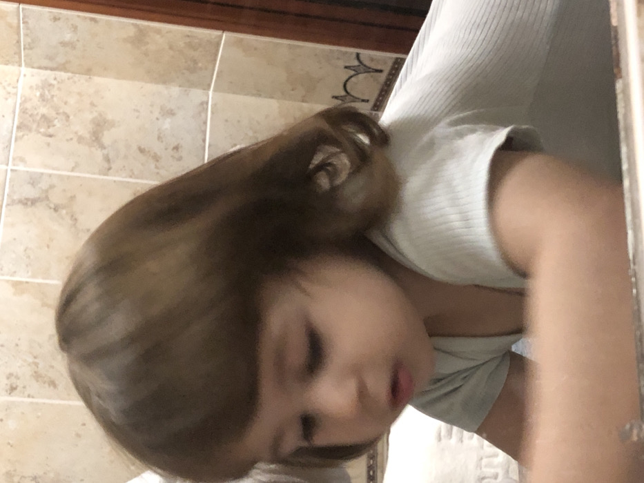 The image displays a close-up, eye-level view of a single young child within an indoor setting. The child, appearing to be a toddler or preschooler, has medium brown, shoulder-length hair styled with bangs. They are wearing a light-colored, ribbed short-sleeved top. The child is positioned leaning forward, with their head tilted downwards and mouth slightly ajar, directing their gaze towards an area below the visible frame. Their arms are extended into the blurred foreground. The background features a wall covered in light brown or beige rectangular tiles with light grout lines, exhibiting a mottled or textured pattern. On the right side of the background, a vertical dark brown element, consistent with a door frame or cabinet edge, is visible. Below this, a decorative border with a repeated arched pattern in a darker tone is present on the tiled wall. The lower foreground displays a blurry, light-colored surface, likely a countertop. The specific location within the city of Saverne, France, cannot be determined from the visual information provided.
