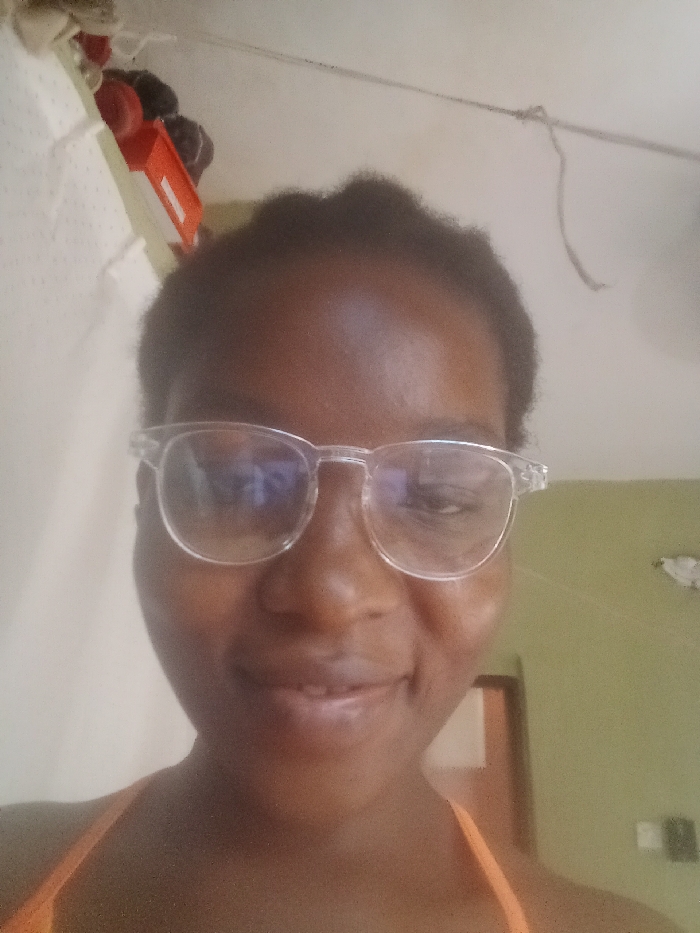 A woman with dark skin and short black hair is seen from a low angle, wearing clear-framed glasses. She is smiling slightly. An orange tank top is visible. The background includes a white wall with some items hanging, possibly toys and a wire. A green wall with a doorway is also visible in the background, creating an indoor setting. The glasses have noticeable glare on the lenses.