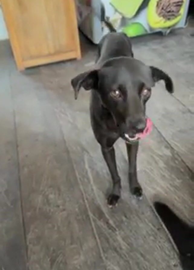 A small, black, short-haired dog stands on a gray, wood-look floor. Its tail wags slightly. The dog has brown eyes and a small, silver spot on its nose. In the background are a light brown wooden cabinet, a refrigerator with a picture of avocados on it, and another dog's tail is briefly visible at the bottom right of the frame. The dog looks alert and expectant.
