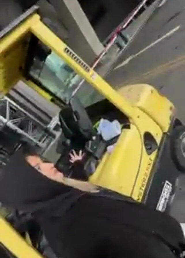 young woman with blonde hair wearing a black hooded sweatshirt and white pants stepping into a yellow forklift truck