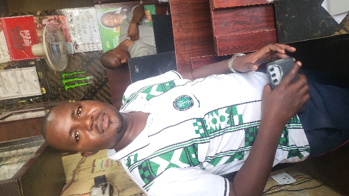 The image depicts an indoor scene in Fagge C, Nigeria, showing two male individuals within what appears to be a commercial establishment. The primary subject, an adult male of dark complexion, stands in the foreground, positioned slightly left of center. He has short dark hair and a neutral expression, looking directly at the camera. He wears a white polo shirt with green and black geometric patterns and vertical stripes, featuring a circular crest on the left chest. Dark trousers complete his attire. A silver-toned watch or bracelet is visible on his left wrist. His right hand holds a dark-colored smartphone, revealing a multi-lens camera module on its rear. In the background, to the right and partially obscured by reddish-brown wooden panels, a second adult male of dark complexion is seated. He wears a light-colored, short-sleeved shirt and is observed leaning forward, seemingly engaged with a dark-colored laptop or device on a counter. His left hand is raised towards his chest area. The background wall is dark, potentially covered with plywood sheets, and heavily adorned with various items: several official-looking documents/certificates, a red Coca-Cola advertisement, a prominent green Monster Energy logo, a small white wall-mounted oscillating fan, handwritten signs (one mentioning "FRESH 350" and "MIRINDA"), and a partial Glo mobile network advertisement featuring a smiling face. A white three-pin electrical outlet is visible on the lower left wall. The reddish-brown wooden panels suggest partitions or shelving units.
