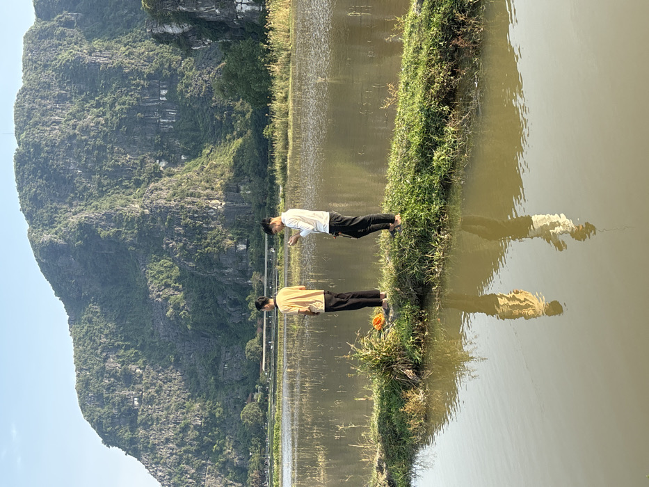 Two males are present in an outdoor scene within Hoa Lư Ward, Vietnam, characterized by flooded fields and prominent karst mountains under a clear sky