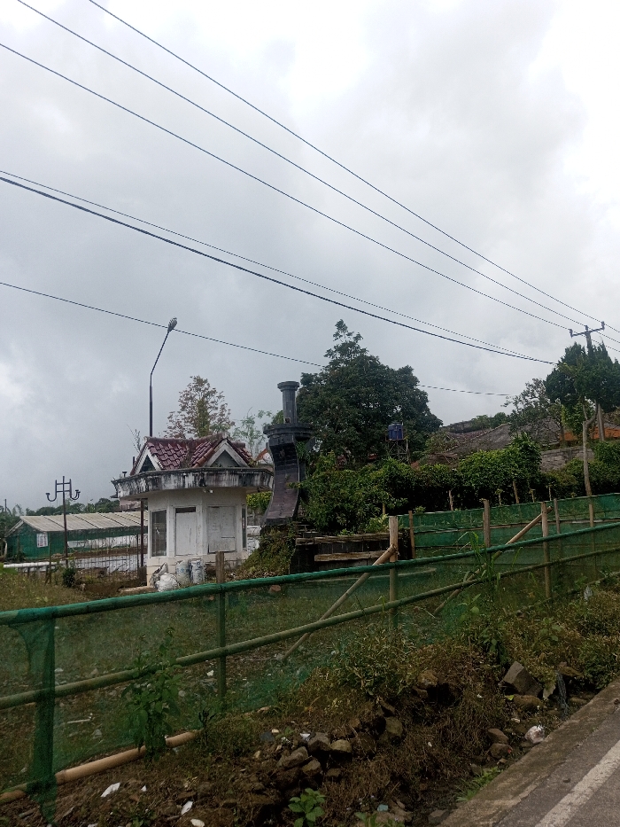 An outdoor scene in Sarwahi Mal., India, depicts a semi-rural environment under an overcast, grey sky. Multiple black utility lines traverse the upper portion of the frame. In the immediate foreground, a dirt and rock embankment with sparse weeds transitions into a narrow, dark grey paved surface, likely a road or path, along the lower right edge. A green mesh fence, supported by bamboo poles, stretches horizontally across the mid-ground, separating the foreground embankment from a grassy area. Beyond this fence, to the left of center, stands a small, white, single-story structure with a red-tiled hip roof featuring decorative gables. Its front presents a closed white wooden door and a window. Several white sacks are placed at its base. A black streetlamp post with a single luminaire extends upward to the left of this building. To the right of the white building, a dark, vertical monument or pillar structure, possibly stone or concrete, is partially visible, obscured by dense green foliage. Further into the background, a large area of lush green trees and shrubs dominates, within which a blue water tank on a metal stand is discernible. Parts of residential structures with tiled roofs are faintly visible amidst the dense vegetation on the right. In the far left background, a green and white building, potentially a greenhouse or agricultural structure, is visible, along with another decorative metal utility pole. No individuals or animals are present.