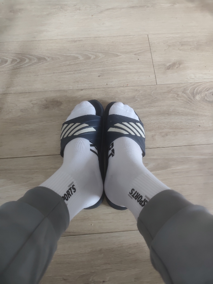 The lower extremities of an individual are depicted from an overhead perspective, standing on a light-colored wooden or laminate floor. No visual indicators within the image confirm a specific location within Augsburg, Germany. The individual wears dark grey athletic pants, white ankle-length socks, and dark blue or black slide sandals with three prominent cream-colored horizontal stripes on the strap of each sandal. The socks feature the word "SPORTS" printed in black, uppercase letters, with smaller horizontal lines above and below the text on the lateral side of both feet. The left foot is positioned slightly to the viewer's left, and the right foot slightly to the viewer's right, appearing parallel to each other. The scene is brightly lit, suggesting an indoor environment. No other subjects or objects are visible. The individual is stationary.