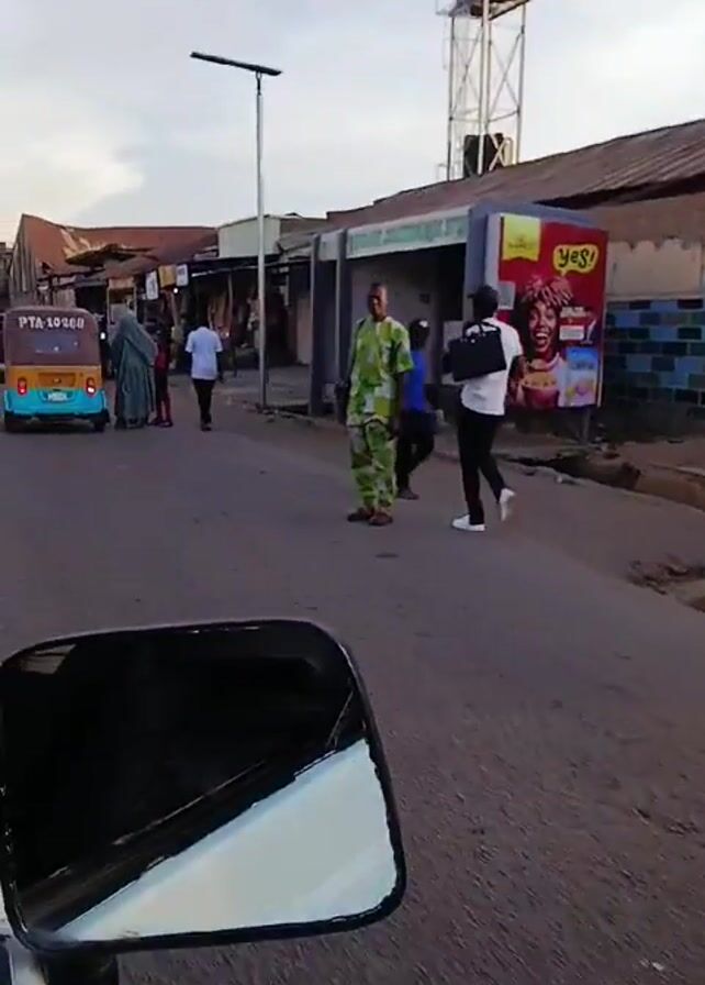 street scene in what appears to be a West African city or town. The shot is taken from inside a vehicle. A light blue and brown auto rickshaw labeled "PTA-10288" is briefly in the foreground. People are walking along the side of the road and in the street. There are various shops and buildings lining the road. A man is pushing a wheelbarrow loaded with items. Several cars are parked along the road. There's a water tower visible in the background. A street light is also visible. The sky is overcast.