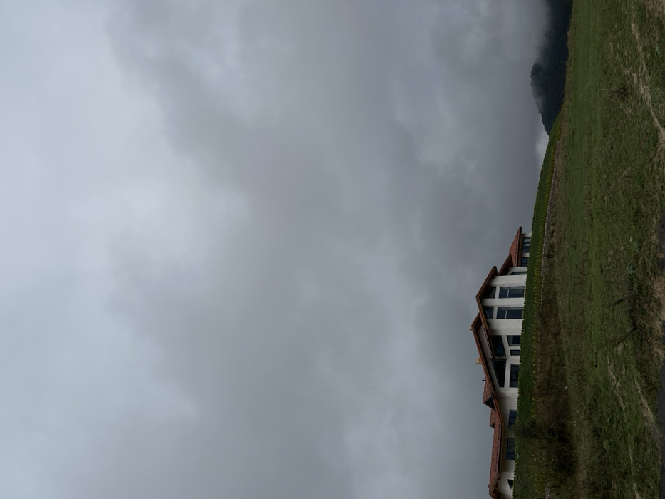 The image presents a modern residence situated on a green hillside under an overcast sky in Dilijan, Armenia. The building features white exterior walls and a multi-gabled roof constructed with red-orange tiles. Multiple large, multi-paned windows are prominent across the facade. The structure is located on a manicured green slope, while the immediate foreground consists of rougher green grass. In the background, forested hills are partially enveloped by dense, low-hanging grey clouds and fog. The upper portion of the frame is dominated by heavy, uniform grey cloud cover. No individuals or vehicles are visible within the scene.