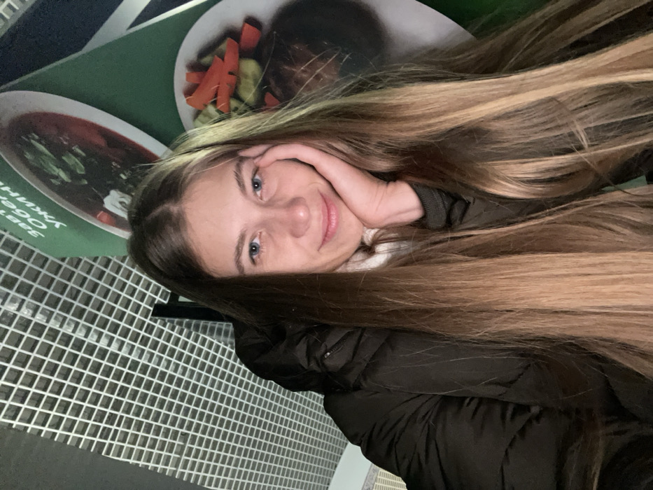 This image depicts a young female individual indoors, in the city of Lyubertsy, Russia. The subject, a woman with long, straight, light brown hair and blue eyes, is positioned facing the camera from a low angle, exhibiting a faint smile. Her left hand is resting against her jawline. She is wearing a dark-colored puffer jacket, with a white collar or turtleneck visible underneath. The background includes a white grid-patterned ceiling structure. To the right of the subject, a large vertical banner or poster is visible, displaying images of food. The upper portion of the banner shows a bowl of dark red soup with a dollop of white cream and green garnish. Below this, a plate with a dark, circular food item and sliced orange and green vegetables is depicted. Partial Russian text, "Завтра Обед Ужин" (Breakfast Lunch Dinner), is visible in green lettering on the banner above the soup image. The setting suggests a food establishment, such as a cafe or cafeteria.