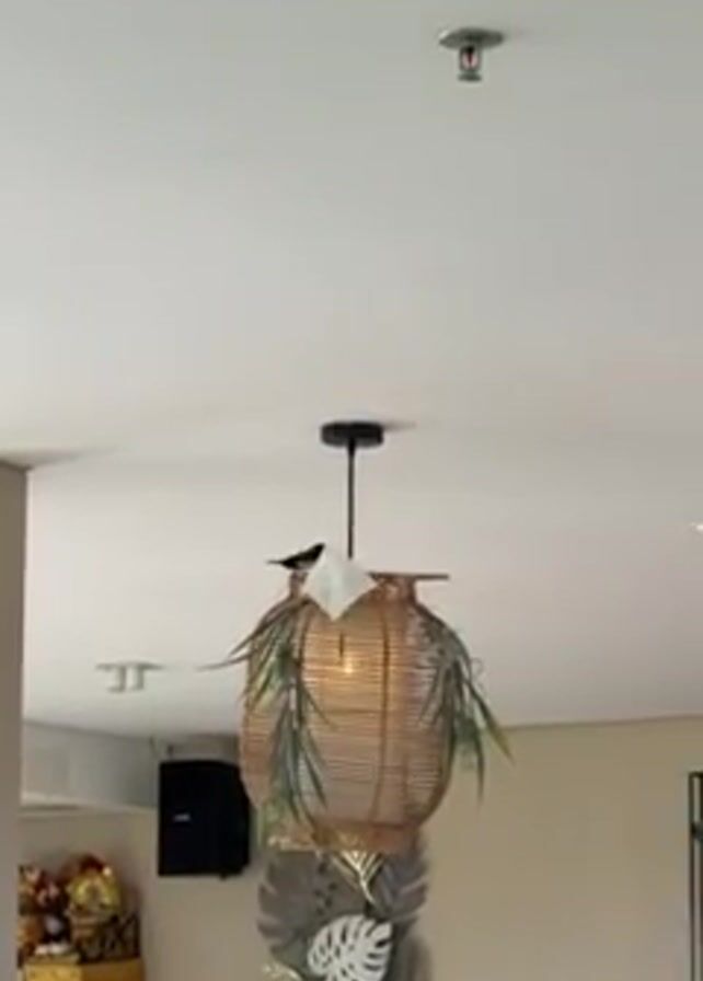 small black and white bird perched on top of a large, decorative wicker light fixture hanging from a white ceiling. The fixture is adorned with leafy green and brown faux foliage. A folded white napkin is also positioned on top of the fixture. In the background, the room has light tan walls and features elements such as a fire sprinkler, a speaker, decorative floral arrangements, and other furnishings, indicating an indoor space.
