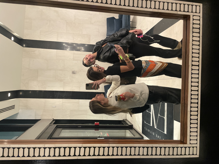Three women pose in front of a large, ornate mirror. The woman closest to the camera is holding a can. The woman in the middle is taking a picture with her phone, and the third woman is facing the mirror. All three women are wearing black pants, and the two women in the front are wearing sweaters. The floor is tiled with black and white tiles. The mirror has a decorative frame.