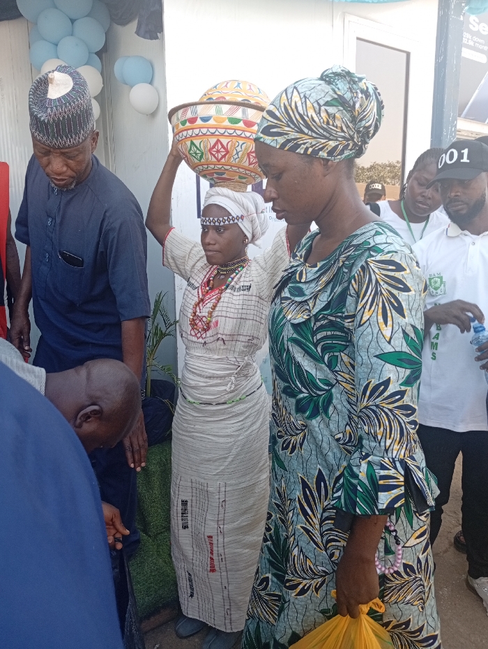 Several individuals are gathered outdoors. One woman is carrying a large, intricately designed bowl on her head. She wears a light-colored dress with beaded jewelry and a headwrap. Another woman in a patterned dress stands to her right. A man in a dark shirt and patterned hat looks down. Other individuals in the background wear casual clothing. Balloons are visible in the background, suggesting a celebration or event.