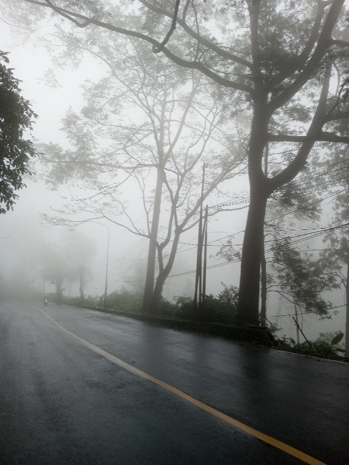 A wet asphalt road curves through dense fog, marked by a blurred yellow line. Tall trees line the roadside, their branches reaching across the frame. Utility poles stand among the trees, their wires barely visible in the mist. The scene conveys a sense of dampness and limited visibility, creating an atmosphere of mystery and tranquility.