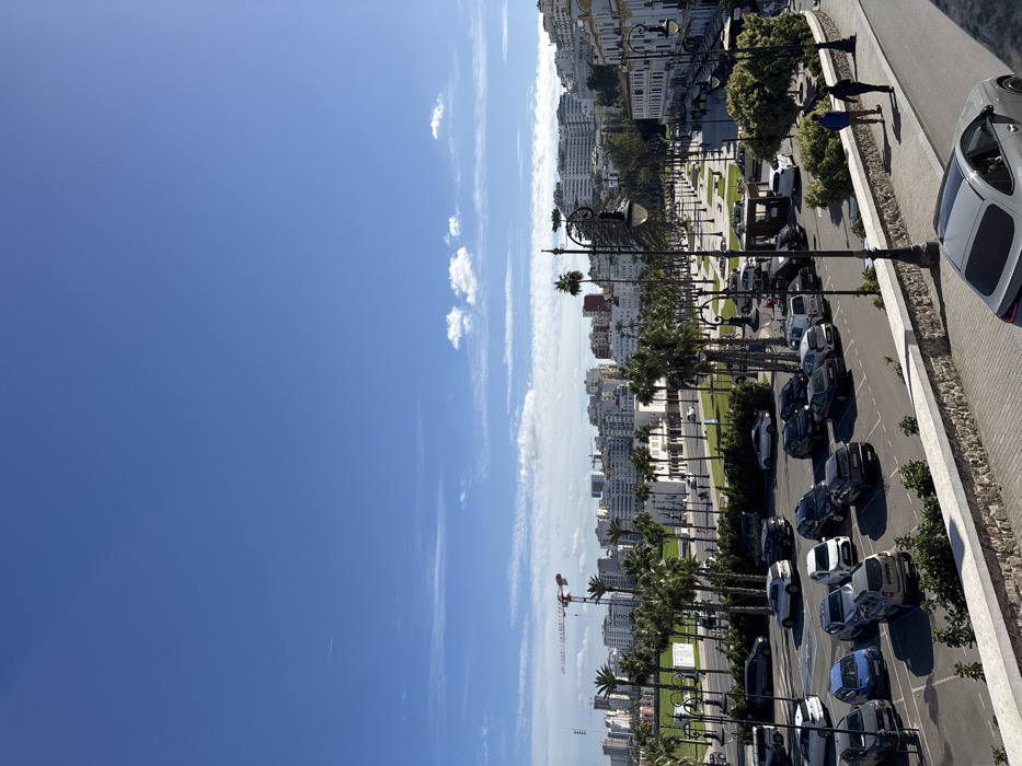 The image displays a wide, elevated view of a bustling urban environment under a clear blue sky with sparse white clouds. The location is a major boulevard or promenade in Tangier, Morocco. In the immediate foreground, a rough-textured stone wall with a light-colored cap runs horizontally. To its right, a grey paved path or roadway is visible, where the rear section of a silver sedan occupies the bottom right corner. Two individuals are walking away from the viewer on this paved path: one in a blue long-sleeved top and dark trousers, and another slightly behind in a dark jacket and dark trousers. The midground features a large, asphalt parking lot on the left, containing approximately 20-25 parked passenger vehicles, primarily sedans and SUVs of various colors. Beyond the parking lot, a multi-lane road stretches across the scene, with several vehicles in motion. This road borders a wide, central landscaped median that extends the length of the visible area. The median is characterized by manicured green lawns, numerous tall palm trees, paved pedestrian paths, and multiple ornate black street lamps with multi-bulb luminaires. Scattered pedestrians are visible walking on the paths within the median. To the right of the median, another road segment is flanked by multi-story buildings with white and light-colored facades, featuring architectural details such as arched windows and balconies, suggestive of commercial establishments at ground level and residences above. The background consists of a dense cityscape of white and light-colored multi-story buildings that ascend a gradual hillside, extending into the distance. A prominent red and white construction crane is visible on the far left horizon, indicating ongoing urban development. The scene is illuminated by strong sunlight, casting distinct shadows.