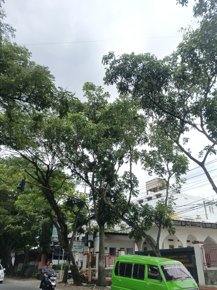 Lush green trees frame a street scene under a cloudy sky. A green van sits on the road's edge, near a building with "Al-Hidayah" sign above its entrance. A motorcycle carries two passengers alongside the street. A traffic light hangs from one of the trees. A building with a water tank on top peeks from behind the trees, adding depth to the composition.
