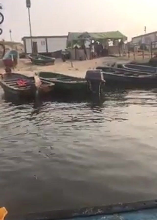 collection of small boats docked or beached along a shoreline under hazy skies, likely during the late afternoon or early morning. The sun is visible through the haze, creating reflections on the water. The boats appear to be simple fishing or transport boats, some equipped with outboard motors. In the background, there are buildings, some covered with a makeshift canopy, and several people are milling about. The footage is shot from a moving boat looking towards the shore. The water is slightly choppy, causing some movement in the foreground.
