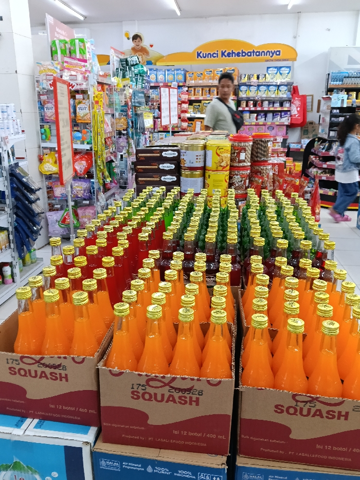A vibrant supermarket display showcases a pyramid of bottled beverages in orange, red, and green hues, each topped with a gold-colored cap. The front row features boxes labeled "SQUASH" in bold lettering, indicating a product of PT LASALLE FOOD INDONESIA. Behind the drinks, various other products like biscuits and confectioneries are visible. A man stands near the display, partially obscured by the stacked goods, while a child walks in the background. A sign with the phrase "Kunci Kehebatannya" hovers above.