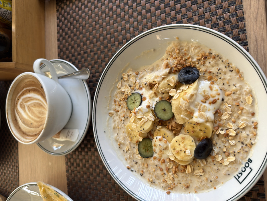 A white bowl of oatmeal with banana slices, blueberries, yogurt, and granola sits on a brown woven surface. A cup of coffee with latte art rests on a saucer beside the bowl. The bowl has a thin black stripe around its rim, with the word "BOOST" printed on the lower right. A partially visible plate with food is at the bottom left corner.