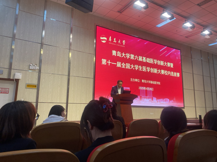conference taking place at Qingdao University, located in the city of Qing Dao Shi, China (latitude: 36.077, longitude: 120.413). A male speaker, wearing a dark suit and a microphone, stands behind a podium, presenting in front of a large screen displaying the text "Qingdao University Sixth National Basic Medical Innovation Grand Meeting, Eleventh National Undergraduate Medical Innovation Grand Meeting Internal Forum." The screen is red and features the university's logo, a red circle with the Chinese characters for "Qingdao University". The speaker is facing a seated audience composed of a group of people, mostly women, all seated in brown chairs. The room has a light brown wall with a single large panel of gray and white sound-absorbing material. The image is taken from a low perspective within the audience. The lighting is bright with overhead lights. There are no objects on the podium except for a laptop.