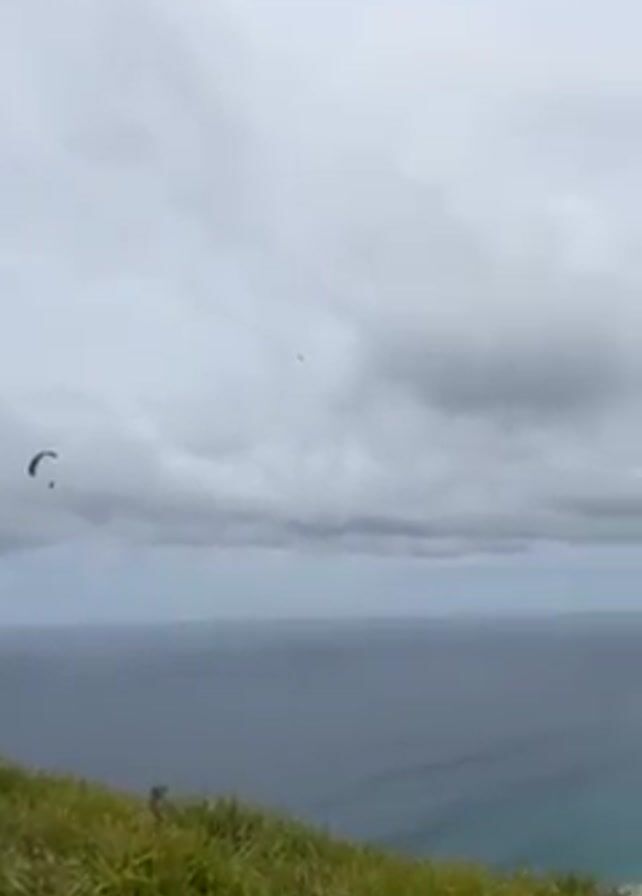 view from a grassy hill overlooking the ocean and a beach. Initially, a paraglider is seen against an overcast sky. As the video pans to the right, a coastline comes into view featuring a sandy beach with waves breaking along the shore. The beach is lined with houses and backed by green hills. The sky remains heavily clouded throughout the video.