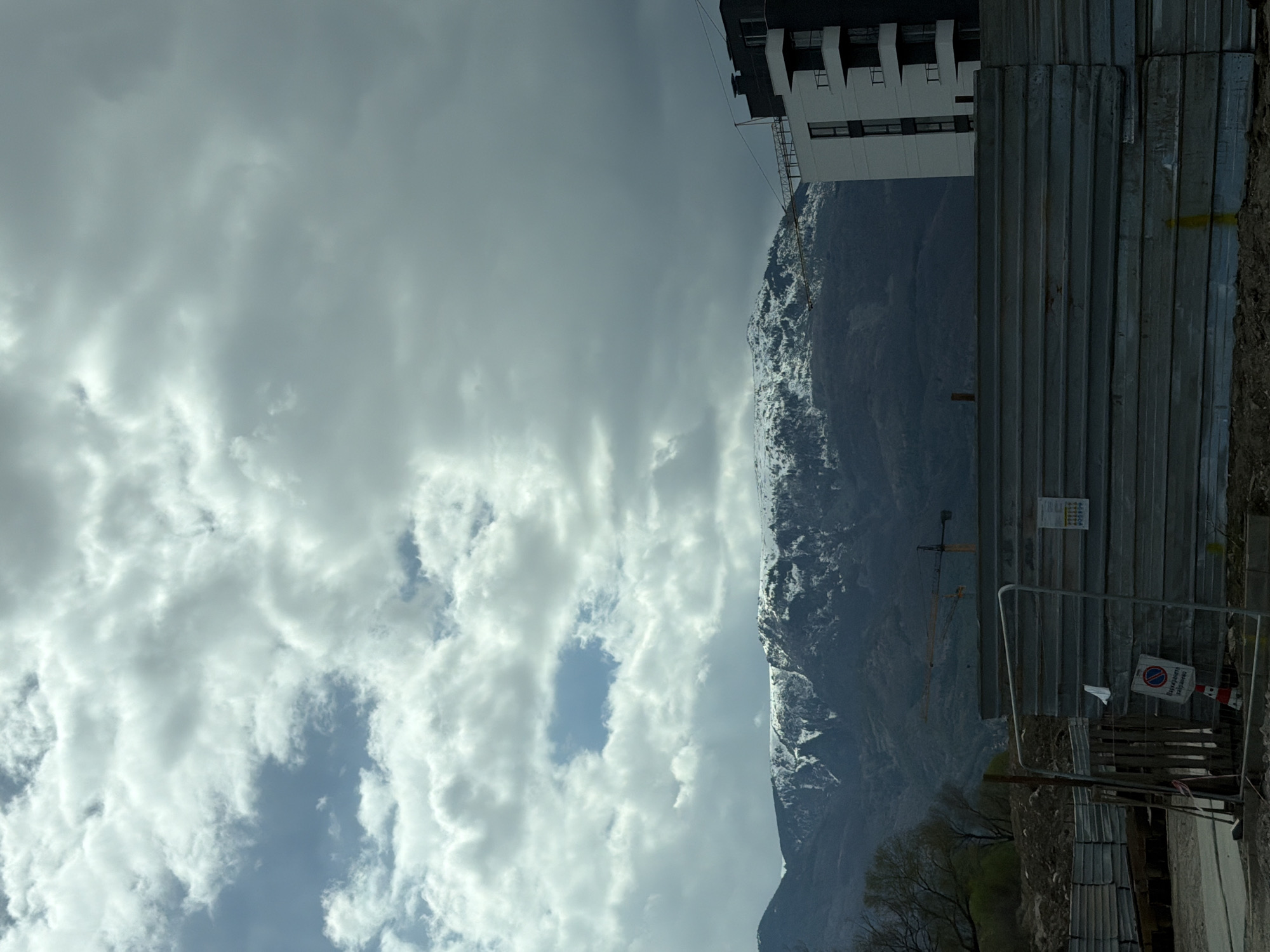 A landscape photograph, rotated 90 degrees counter-clockwise, depicts a partially cloudy sky and a mountainous terrain. A corrugated metal fence runs along the right edge of the frame, with construction materials and debris visible below it. A building is situated above the mountain range, with windows and what appear to be balconies visible. A construction crane is also visible. The location is unknown.