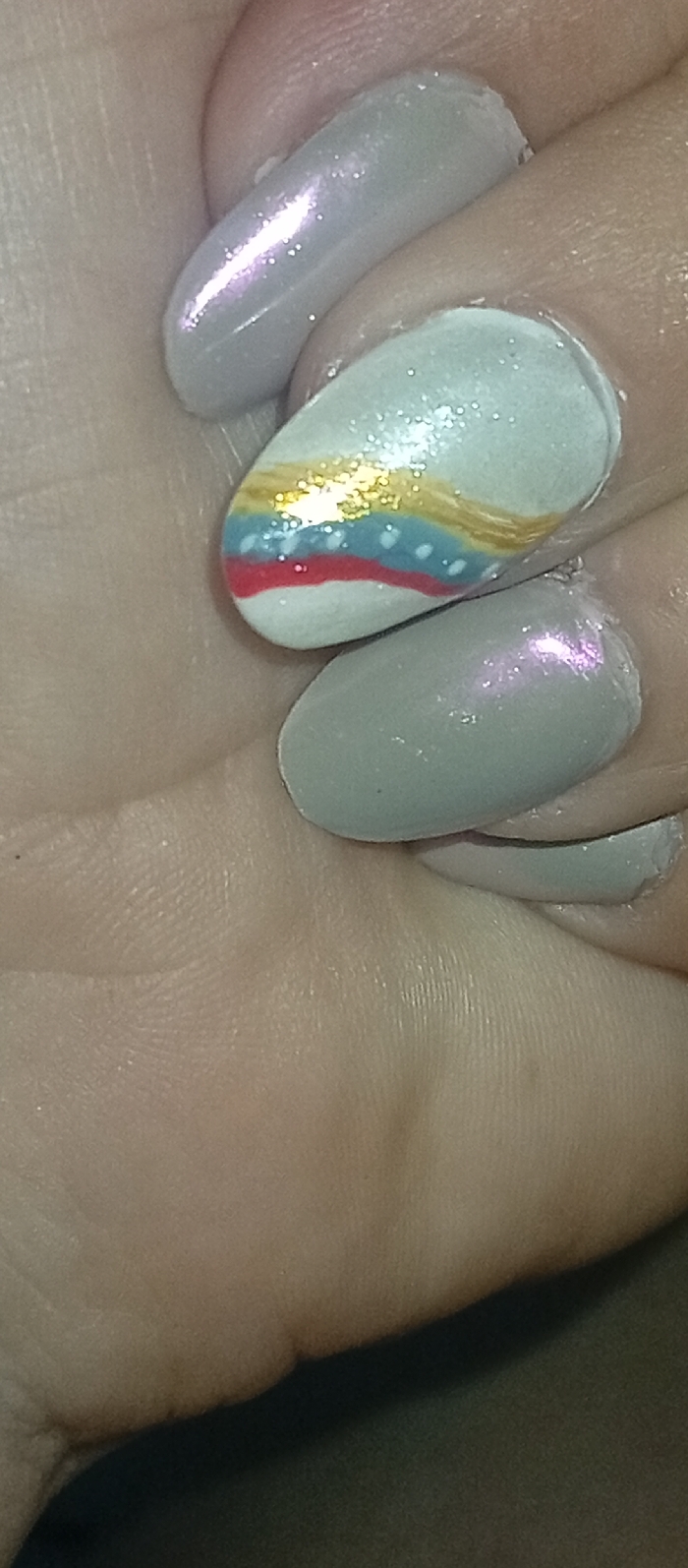 A close-up shot showcases manicured fingernails against a backdrop of skin. Two nails feature a shimmering, light gray-purple polish. The middle nail displays a unique design: a horizontal pattern of red, blue, and gold streaks applied over a light green base. The polish appears slightly uneven, adding to the homemade aesthetic.