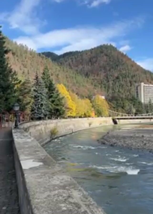 The video showcases a serene scene of a river flowing next to a paved walkway with a low concrete wall, with lush trees and a mountain in the background under a partly cloudy blue sky. The river water is moving rapidly and appears slightly rocky. The trees include evergreen pines and deciduous trees with some yellow leaves, suggesting it's autumn. A suspension bridge is visible in the distance. A tall building stands adjacent to the mountain. There are lamp posts and benches along the walkway, indicating a park or recreational area. The camera moves slightly to the left during the video.