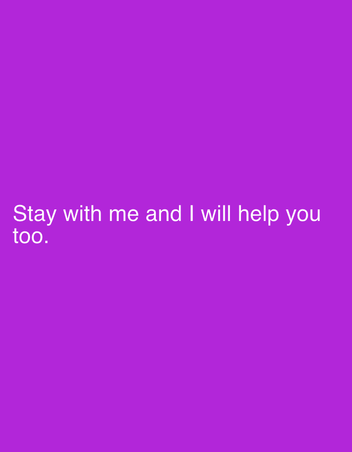 - "A solid purple background displays the white text "Stay with me and I will help you too" by FM-IswF63, licensed under CC BY 4.0