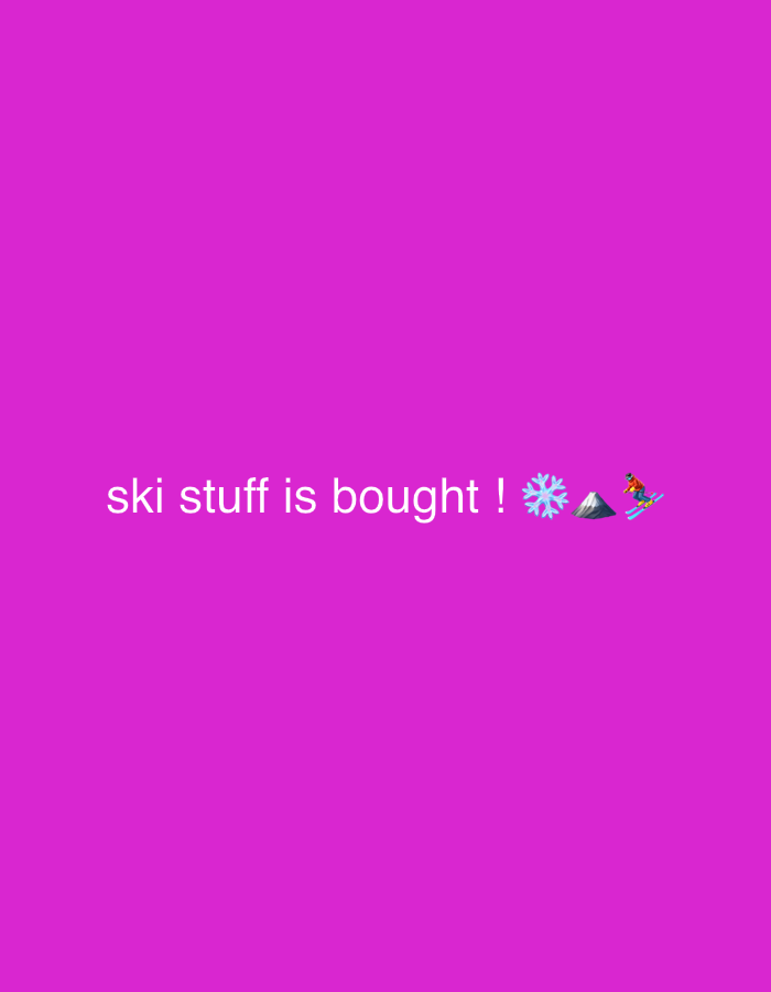 A white text in the center reads "ski stuff is bought!". To the right of the text, there's a sequence of emojis: a snowflake, a mountain, and a person skiing downhill. The background color is a vibrant magenta.