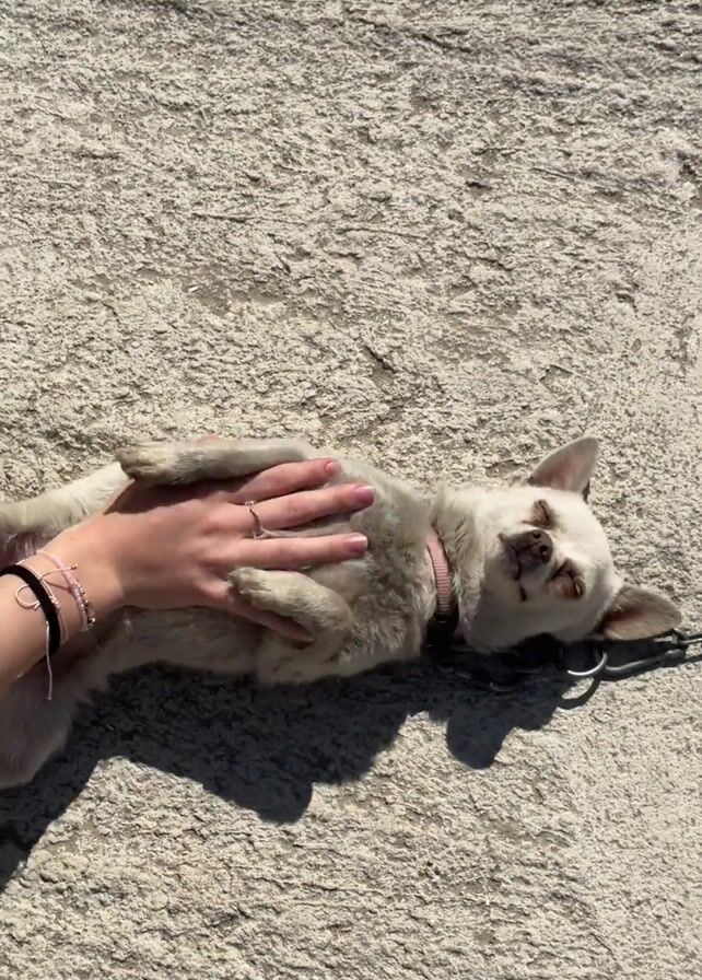 - "small, light-colored dog lying on its back on a grey, rough concrete surface" by FM-69N2F2, licensed under CC BY 4.0