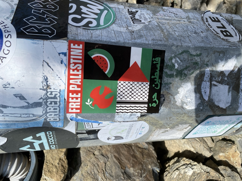 The image displays a metallic utility pole, heavily covered with numerous stickers, located in Corniglia, Italy. The pole exhibits signs of wear, including scratches, fading, and remnants of torn paper from older stickers. Centrally affixed is a large rectangular sticker with a red band at the top displaying "FREE PALESTINE" in white capital letters. Below this, the sticker is divided into four quadrants: the top-left features a red dove with an olive branch on a green background; the top-right shows a slice of watermelon on a black background; the bottom-left depicts a black and white keffiyeh pattern; and the bottom-right presents the Palestinian flag (black, white, green horizontal stripes with a red triangle). A black strip at the bottom of this sticker contains green Arabic text, translating to "Palestine is free." Surrounding this central sticker are various other decals, including a prominent "AC/DC" logo, an "SVW" logo, "UMO COCCO OUTDOOR EXPERIENCES," "BABELSHOP," "ITINARRANDO" with an owl graphic, "TOPLINE Feat Tiger H," and "BLE Best Life Ever Flagstaff - Arizona." A QR code sticker for "TREKKING4LIFE.PT" is visible lower on the pole. To the left of the pole, a rough-hewn stone wall or rock formation, composed of various brown and grey stones, is partially visible. A white corrugated pipe or conduit is seen behind the upper left portion of the pole. The scene is illuminated by daylight, casting a shadow on the lower right section of the pole. No people or overt actions are depicted.