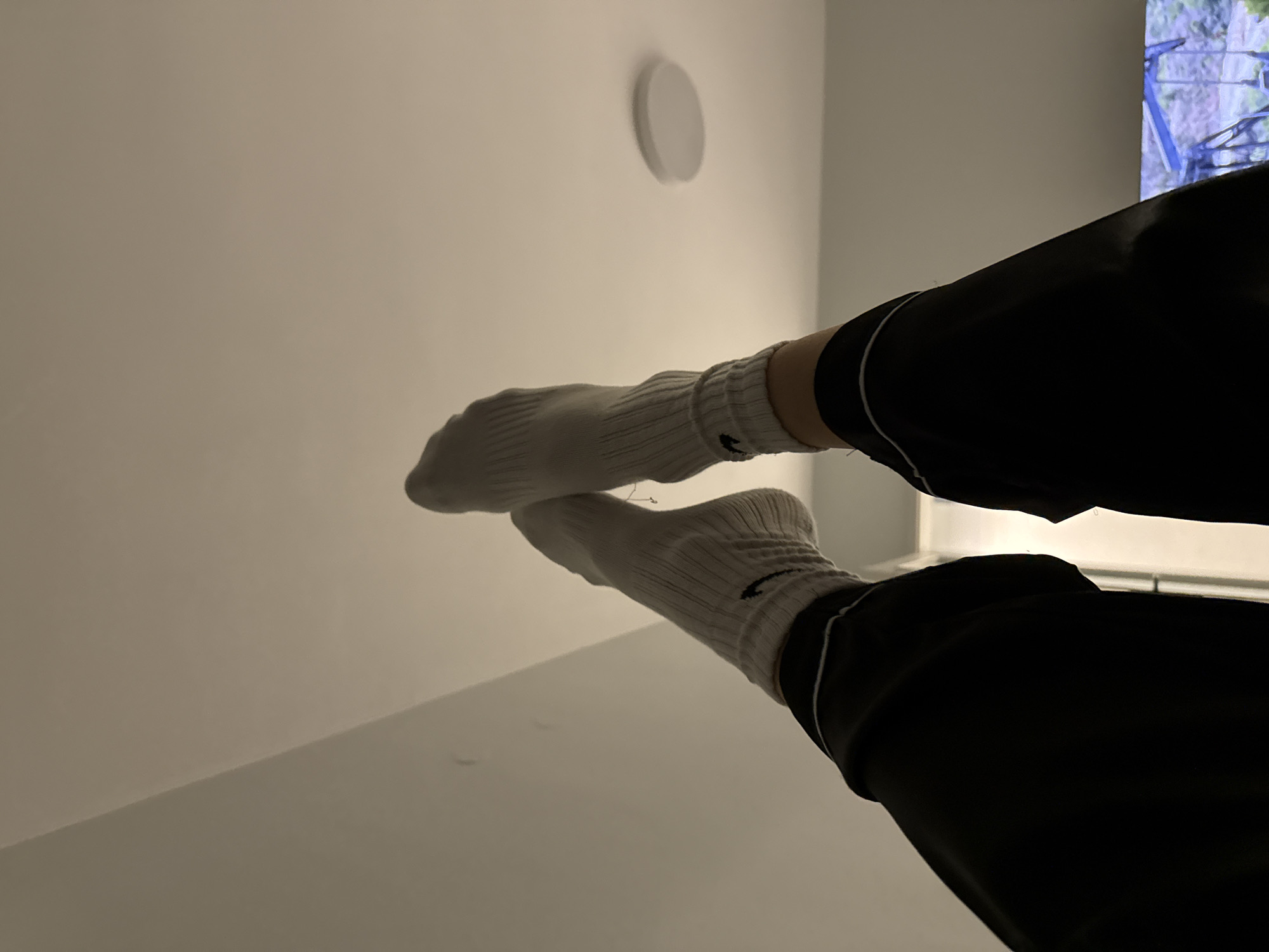 A low-angle shot depicts a pair of legs extending upward into the frame. The legs are clad in black track pants with a white stripe down the side, and white socks. The background reveals a plain white ceiling with a circular light fixture. The perspective is looking up towards a television screen in the upper-right corner. The image does not provide any information to identify that it was taken in Sofia, Bulgaria.