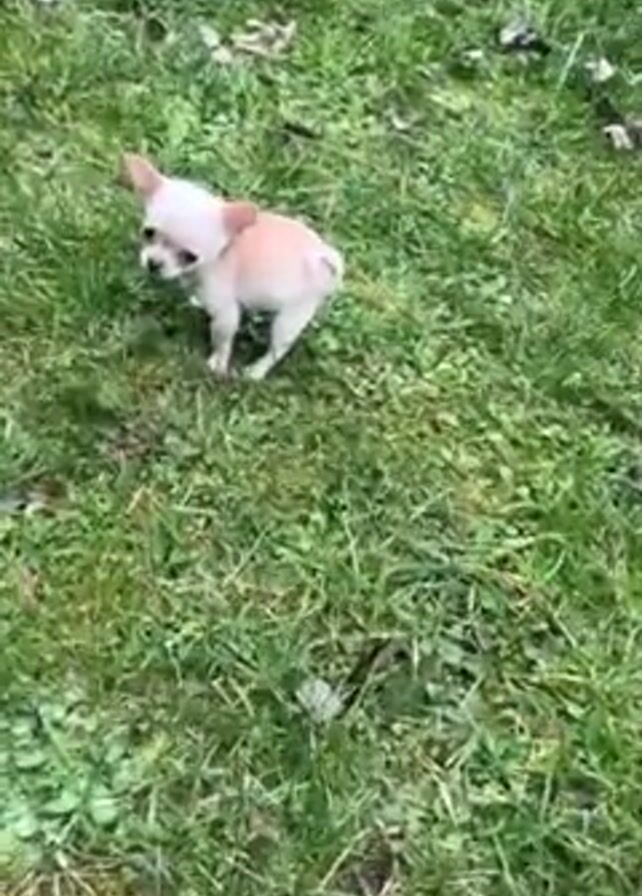 A very small, light-colored Chihuahua puppy stands on a patch of green grass