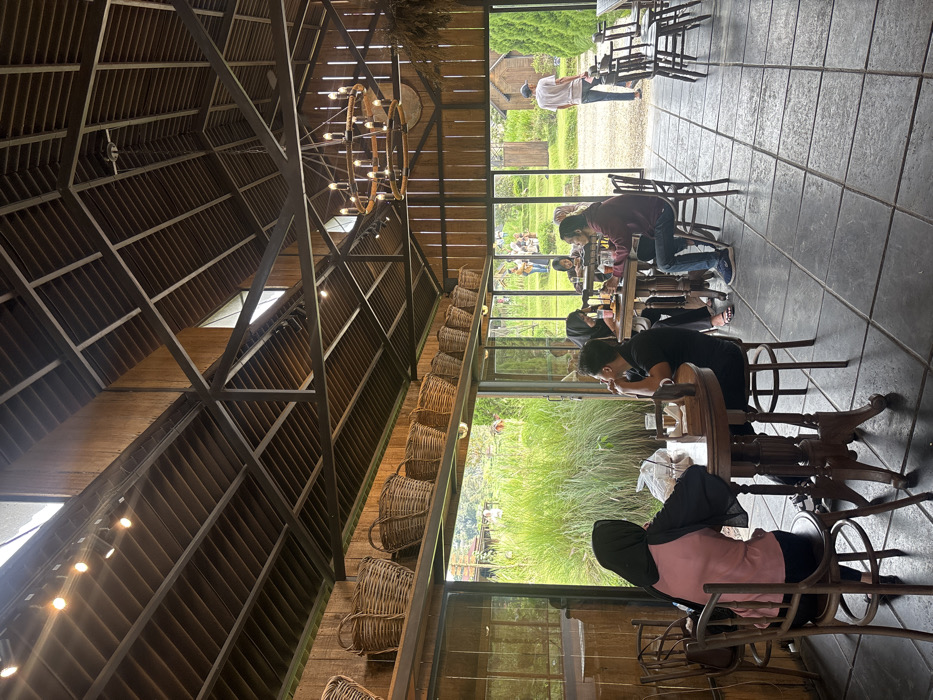 A unique perspective inside a restaurant with a high, exposed-beam ceiling featuring a chandelier and decorative baskets. People are seated at tables, some looking out through large windows onto a green, grassy area. The interior is dimly lit, contrasting with the brighter outdoor view. The arrangement of tables and chairs creates a spacious yet intimate dining atmosphere.