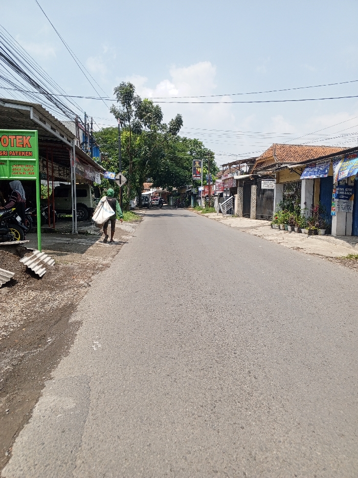 The scene depicts a daytime street in the city of Multhan, India. An asphalt road occupies the center and foreground, extending into the distance under a partly cloudy sky. On the left side, a pedestrian walks away from the camera on a dirt and concrete sidewalk, carrying a large white sack over their left shoulder. This individual wears a long-sleeved green shirt and dark pants. Adjacent to them, under a shaded structure with a corrugated metal roof, a green sign reads "APOTEK SRI PATEKEN." Two motorcycles, one yellow and black, are parked beneath this structure, with a white van partially visible behind them. Loose corrugated metal sheets lie on the ground near the left edge. Numerous overhead utility lines traverse the upper left quadrant of the image. On the right side of the road, a row of single-story buildings with varied facades and tiled roofs line a concrete sidewalk. Several potted plants are arranged in front of these structures. A blue awning on one building shows partial text, "MIMI ATIK ERBALA." Further down the street, trees and additional buildings are visible. A black and white arrow sign on a pole points left, away from the camera. The overall environment is a built-up, semi-urban area.