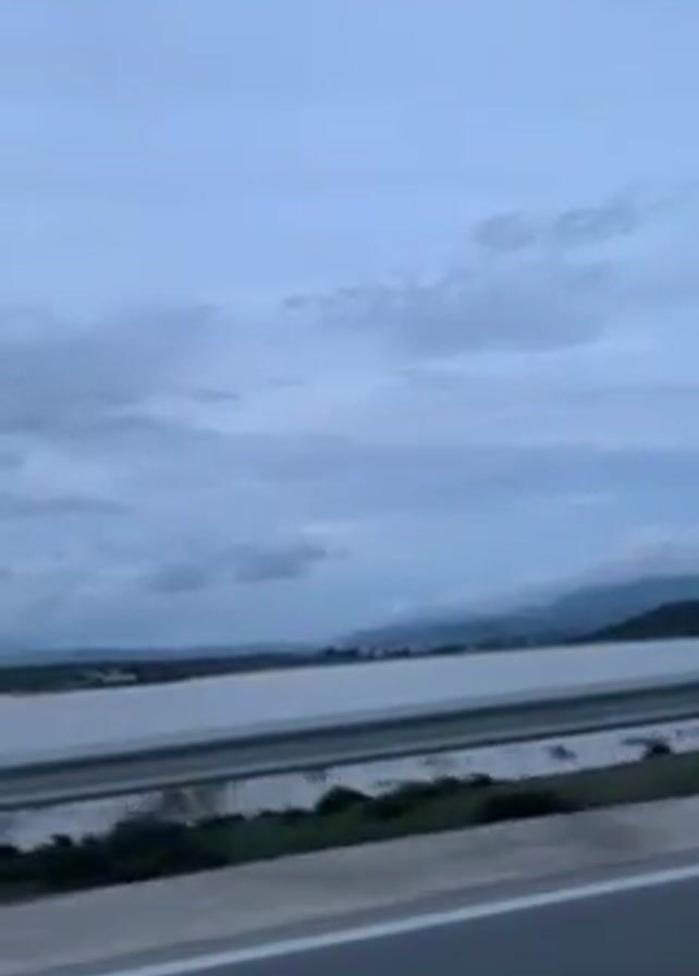 The video depicts a view from inside a moving car, driving along a highway