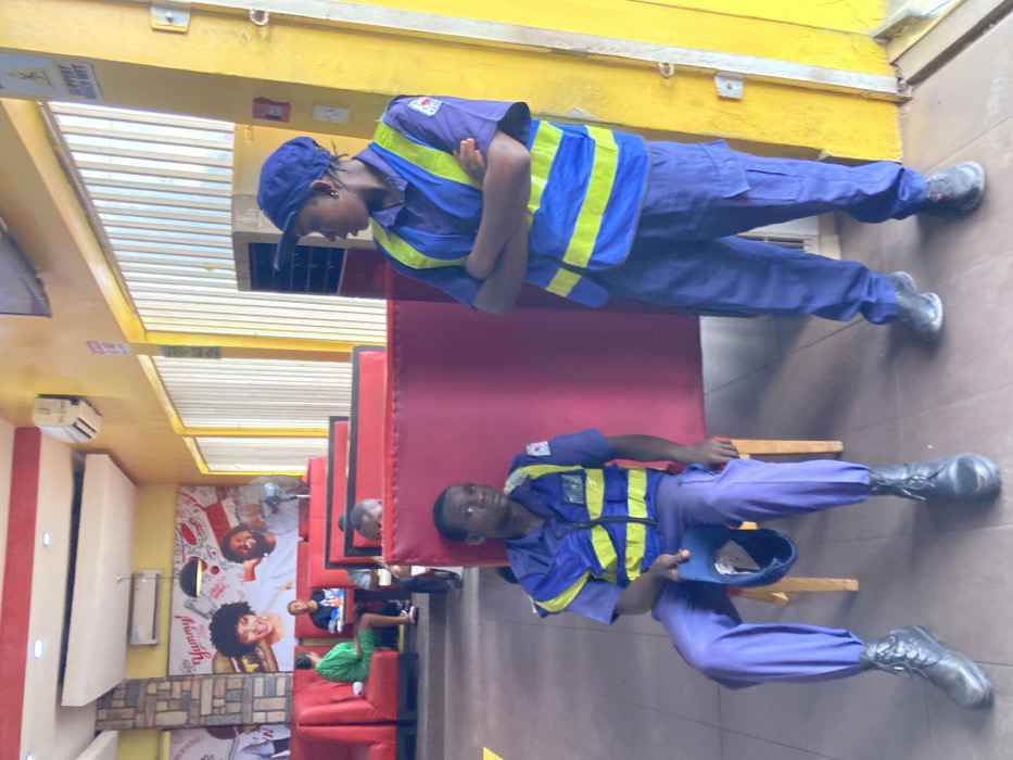 The image depicts the interior of a fast-food restaurant or similar commercial eatery in Aba, Nigeria. In the foreground, two individuals are present, presumed to be security personnel due to their attire. On the left, a male is seated on a wooden chair, wearing a dark blue short-sleeved shirt, dark blue trousers, black lace-up boots, and a blue reflective safety vest with horizontal yellow-green stripes. He holds a dark blue cap in his hands, resting on his lap, and looks directly forward. To his right, a second male stands with his arms crossed over his chest, facing left, and wearing an identical dark blue uniform with a blue cap and a reflective safety vest. The background shows multiple rows of red upholstered booth seating and tables. Several patrons are visible, with one woman in a green dress seated at a booth on the far left. The wall on the left features a large mural depicting a smiling man and woman, along with the text "Yummy!". Air conditioning units are mounted near the ceiling, which is white and contains light fixtures. The right wall is painted yellow and includes windows fitted with vertical blinds, allowing natural light to enter. A "Slippery When Wet" warning sign is affixed to the yellow wall. The floor is dark and reflective.