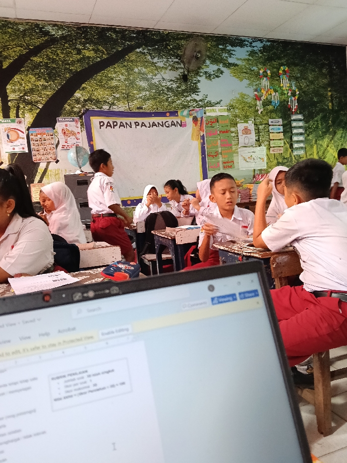 A classroom scene depicts students in red and white uniforms seated at desks. They appear to be engaged in a lesson or activity, with some interacting with each other. The backdrop features a nature-themed mural and an empty board labeled "Papan Pajangan". A computer is in the foreground, its screen displaying a document in a language other than English. The setting suggests a school in a region where the language of the document is spoken.