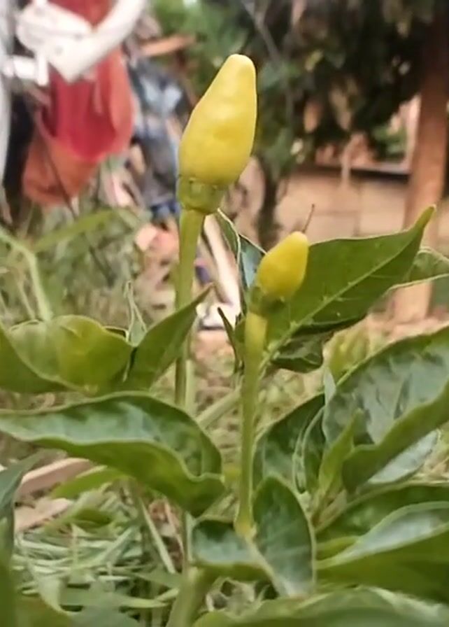 close-up view of a small chili pepper plant outdoors. The plant has green leaves, and two immature chili peppers, which are light green to yellow in color, are visible. In the background, there are blurred objects, including what appears to be a piece of clothing hanging on something. There is also grass and other greenery around the plant. The overall setting seems to be in a garden or backyard area.