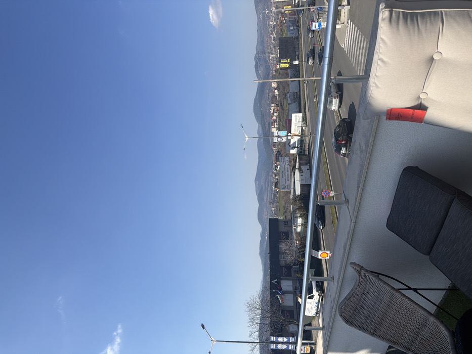 The image presents an elevated, wide-angle view of a section of Kardzhali, Bulgaria, specifically overlooking Bulgaria Blvd. 116, identifiable by the Mitkom AD Toyota dealership and a Shell gas station. The foreground features a white balcony railing with metallic horizontal bars. On the balcony, parts of outdoor furniture are visible: a wicker chair on the left, a dark grey cushioned chaise lounge in the center, and a beige cushion with a red tag on the right. The midground encompasses a multi-lane asphalt road, Bulgaria Blvd., actively traversed by vehicles including multiple passenger cars and a white commercial van. Roadside elements include traffic signage and tall streetlights with dual lamp heads. On the left side of the road, a dark commercial building, Mitkom AD (a Toyota dealership), displays a large 'A' logo and flies Bulgarian and European Union flags. A Shell brand logo is visible near the road. Bare trees are situated in front of the dealership. On the right, additional commercial structures and billboards are present, one featuring Bulgarian text and the word "PREMIUM." The background reveals a dense urban development comprising numerous buildings and structures, extending into the distance. The city is bordered by a range of hills or mountains characterized by sparse vegetation. The sky is clear, uniformly blue, with minimal, scattered white clouds at the extreme edges of the frame. The scene is illuminated by direct sunlight.