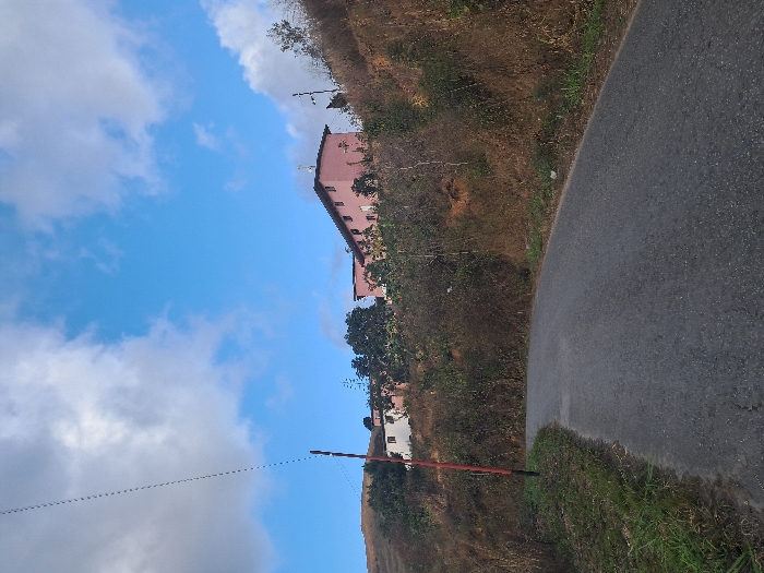 A road curves into the frame, bordered by a grassy edge and a steep, brown hillside. A large pink building with multiple windows sits further up the hill, partially obscured by trees. The sky is blue with scattered clouds. A power line is visible in the foreground, stretching towards the building.